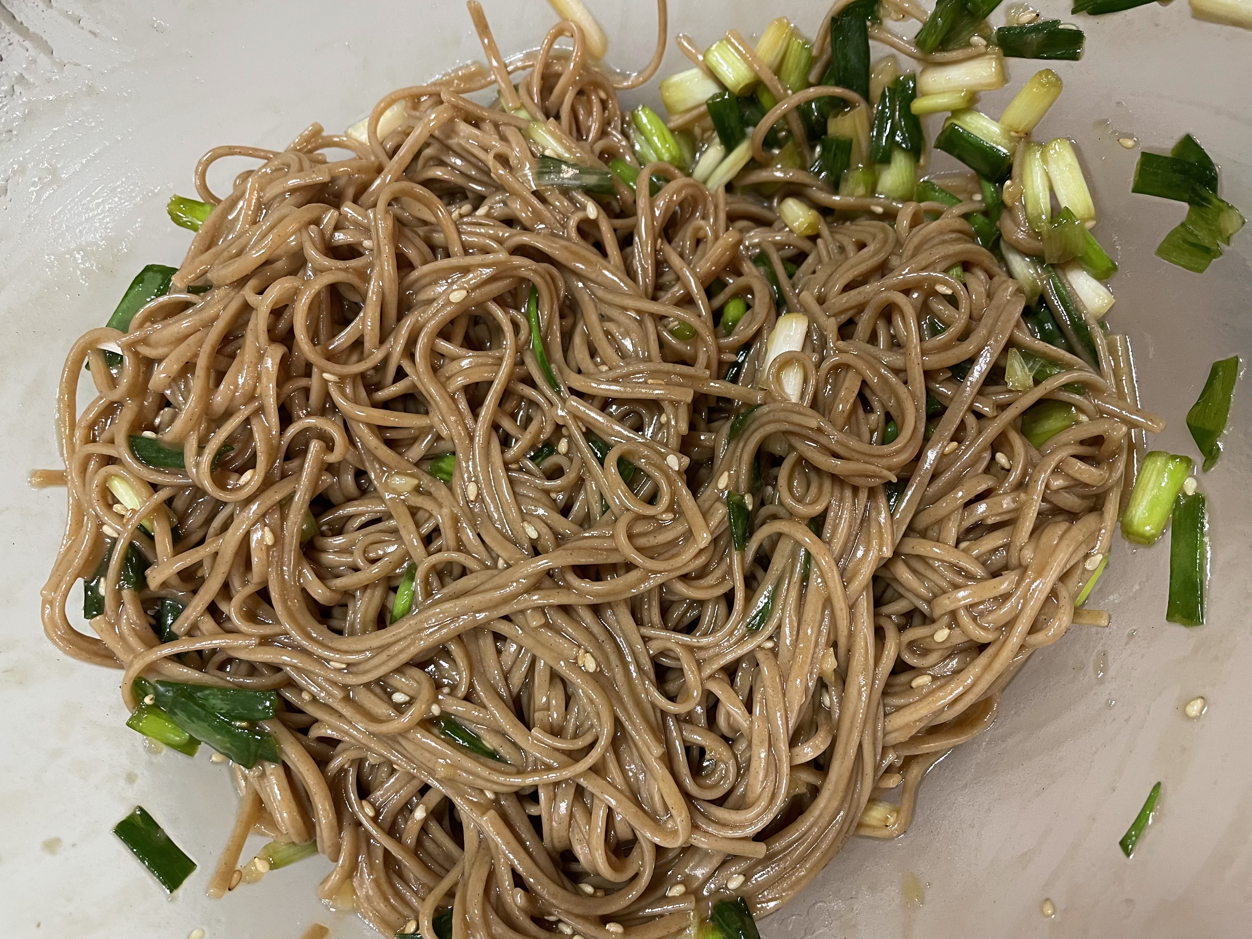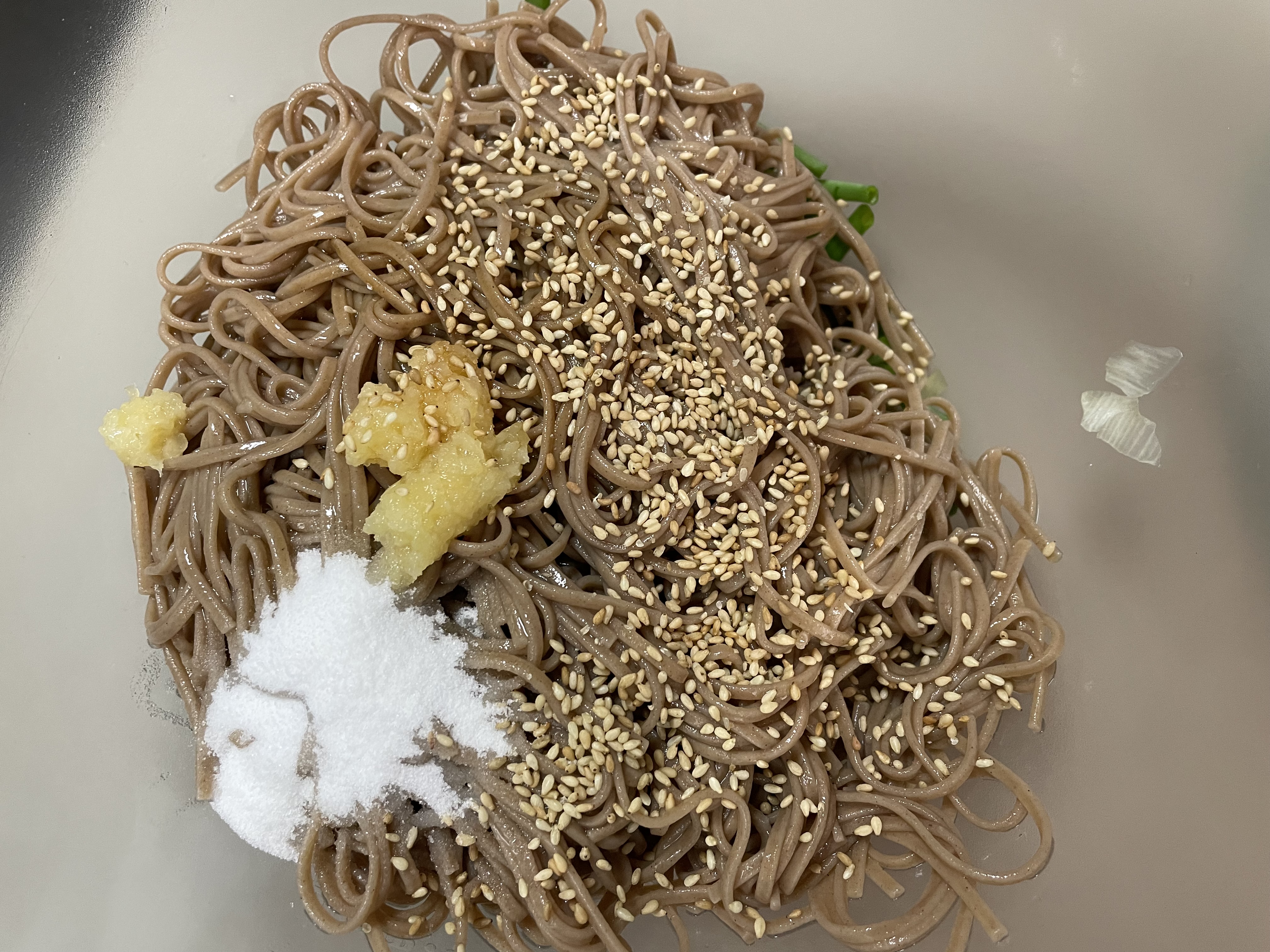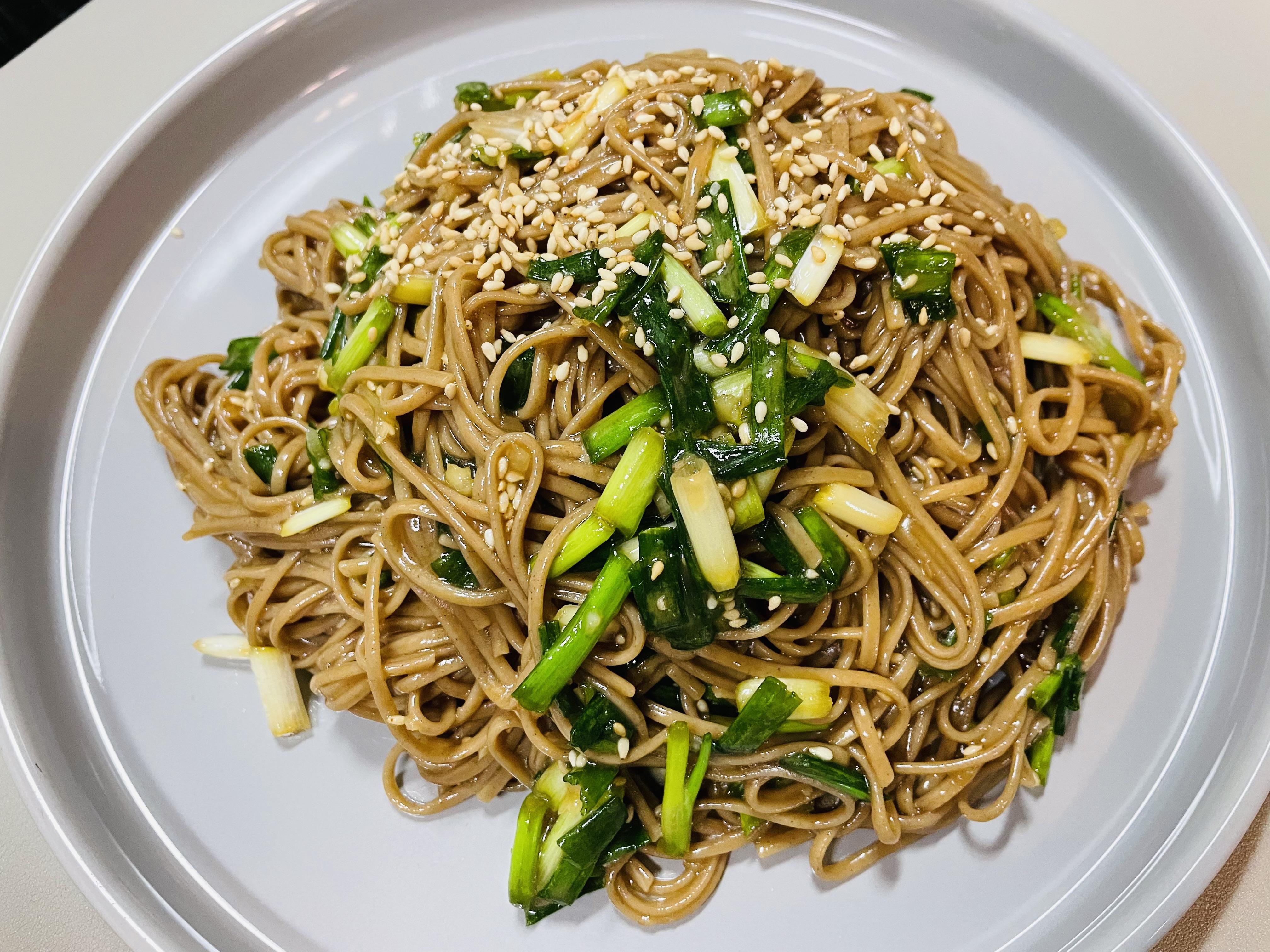 재료는 메밀국수면, 쪽파, 다진 마늘, 간장, 참기름, 맛소금, 설탕, 통깨입니다!!